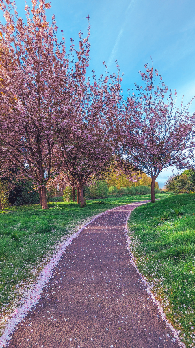 两旁树木枝叶繁茂,嫩绿新叶与洁白繁花交织,似为小径撑起绿白华盖.