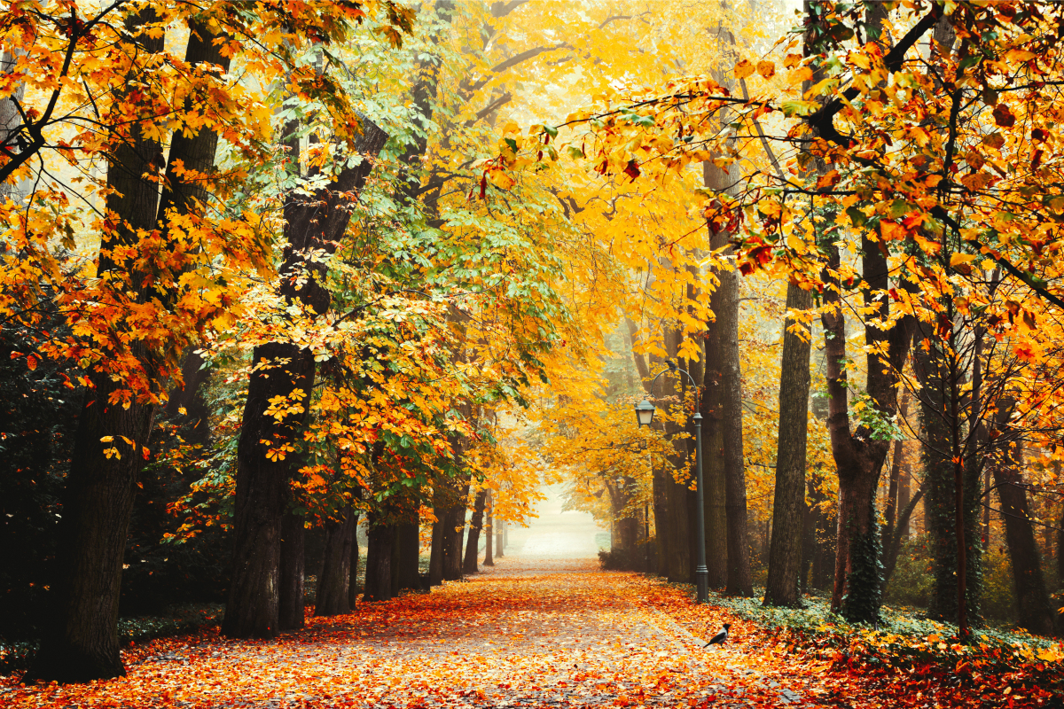 两侧的梧桐树叶由绿转黄,成排的梧桐树把道路装扮成一条金色的长廊